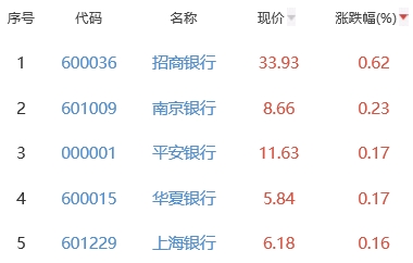 其中,招商银行、南京银行、平安银行、华夏银行、上海银行位列板块涨幅前五位,涨幅分别为0.62%、0.23%、0.17%、0.17%、0.16%。