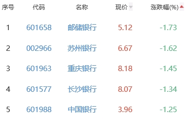 邮储银行、苏州银行、重庆银行、长沙银行、中国银行位列涨幅榜后五位,涨幅分别为-1.73%、-1.62%、-1.45%、-1.34%、-1.25%。