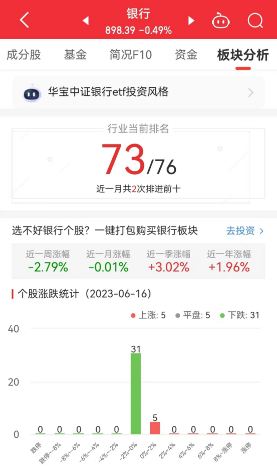 6月16日讯今日,银行板块整体涨幅-0.49%,其中5只股票上涨,5只股票平盘,31只股票下跌。