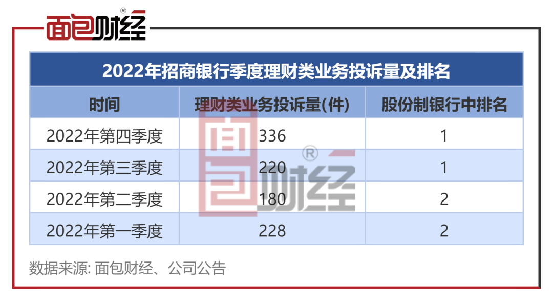通报显示,2022年第四季度,招商银行的理财业务投诉量为336件,居股份制银行之首。三季度,该行的理财业务投诉量为220件,同样居股份制银行榜首。