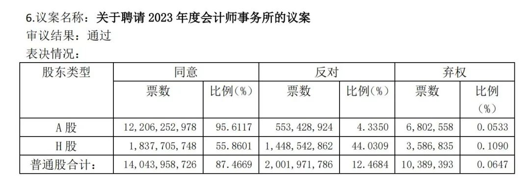 这份《关于聘请 2023 年度会计师事务所的议案》,投票结果显示,44%的H股股东投出了反对票,4%的A股股东也投票反对,反对票合计高达普通股的12.47%。