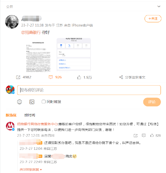对此,招商银行网络经营服务中心在该用户微博下评论称,很抱歉给其带来困扰,如方便可通过私信提供联系电话,以便招行进一步向相关部门反馈。