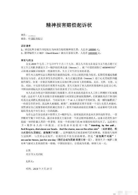 近日,某微博用户发文称,其在一边听音乐一边工作时,被招商银行“无端电话骚扰”,导致“精神一度崩溃失常,失去了对生活仅有的希望”,故而向南京市人民法院起诉招商银行,诉请招行赔偿其精神损失费10万元,并附带赔偿相关歌手演出名誉损失费100万元。