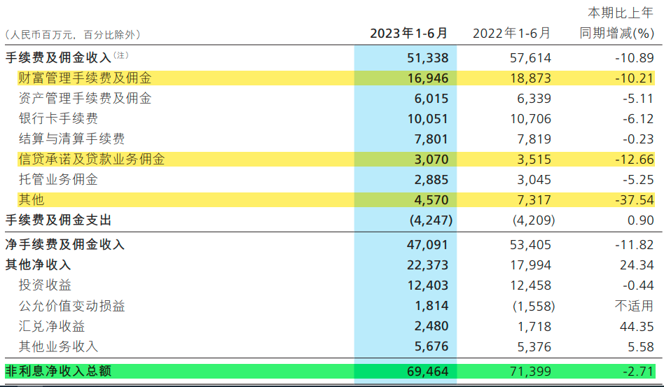 上半年,大财富管理业绩改善不理想,非利息净收入中: