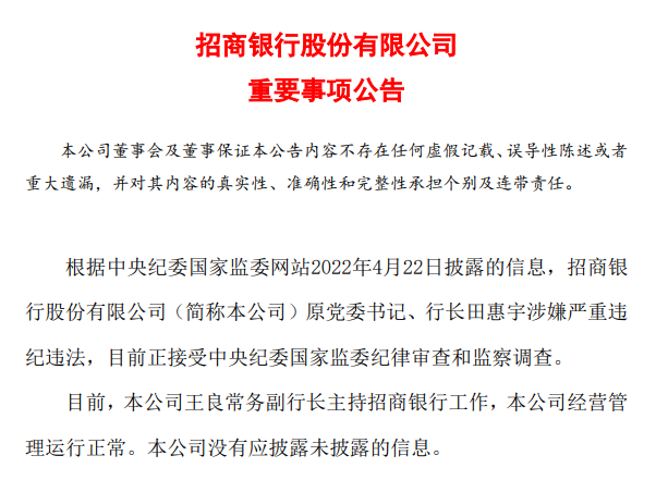 但仅仅4天后,4月22日,招行再次发公告,原党委书记、行长田惠宇因涉嫌严重违纪违法,正在接受中央纪委国家监委纪律审查和监察调查。