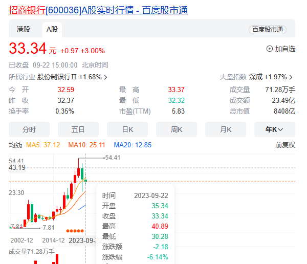 总资产超10万亿的招行,2021年市值超1.47万亿,2022年高点市值约1.33万亿。但截至9月22日收盘,其市值为8408亿元,较2021年高点市值蒸发了6000多亿元。