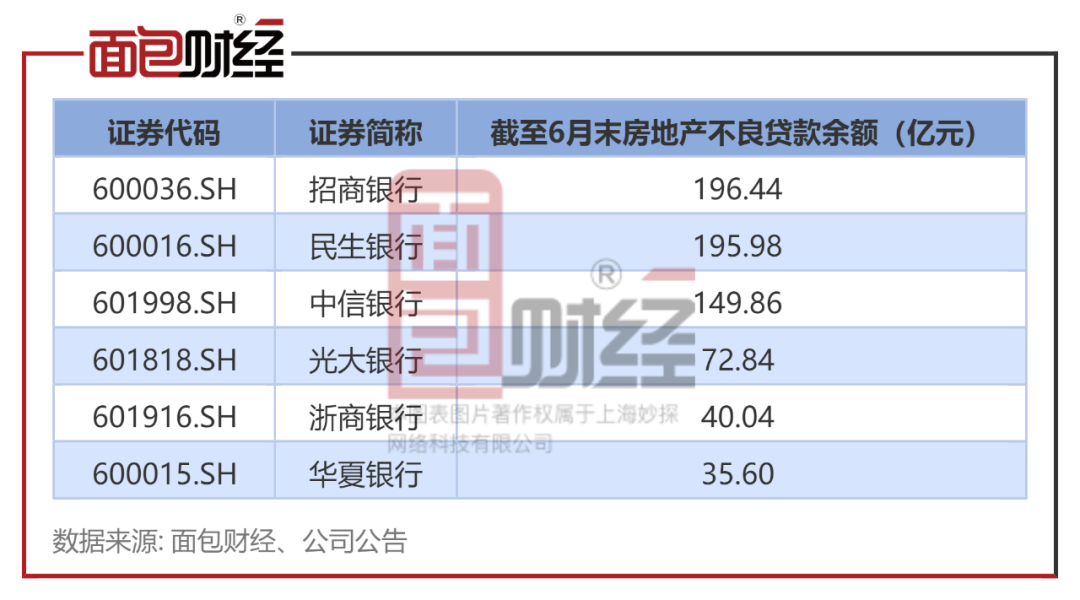与其他股份行相比,2023年中报有6家股份行披露了房地产不良贷款余额,其中,招商银行的房地产业不良贷款余额最高,达196.44亿元。