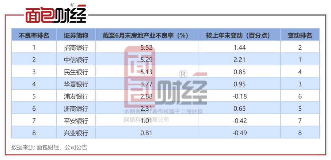 截至6月末,招商银行的房地产业不良率居首,为5.52%。兴业银行和平安银行的房地产不良率偏低,分别为0.81%和1.01%。