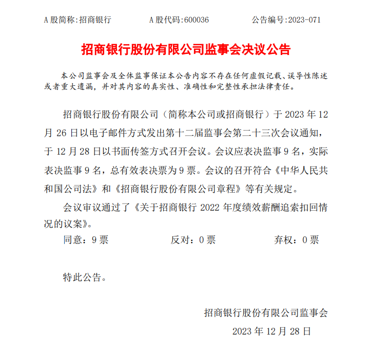 12月28日晚间,招商银行发布公告,通过了《关于招商银行 2022 年度绩效薪酬追索扣回情况的议案》。