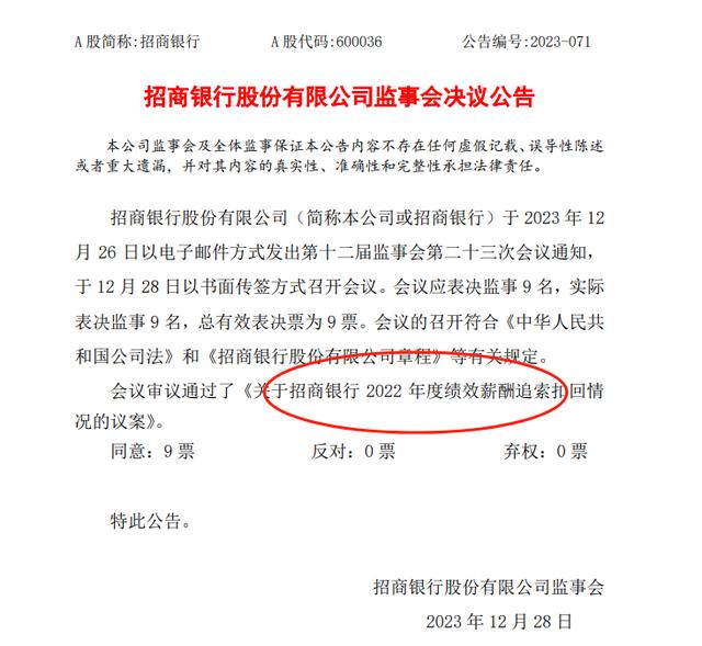 12月28日晚间,招商银行发布监事会决议公告,审议通过了《关于招商银行2022年度绩效薪酬追索扣回情况的议案》。此前12月1日,招商银行董事会已审议通过了该议案。