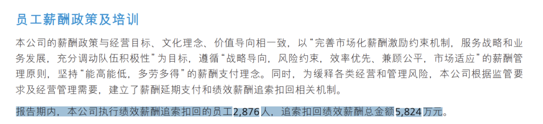 据招行在今年3月公布的2022年年报中披露显示,为缓释各类经营和管理风险,公司根据监管要求及经营管理需要,建立了薪酬延期支付和绩效薪酬追索扣回相关机制。2022年,执行绩效薪酬追索扣回的员工2876人,追索扣回绩效薪酬总金额5824万元。