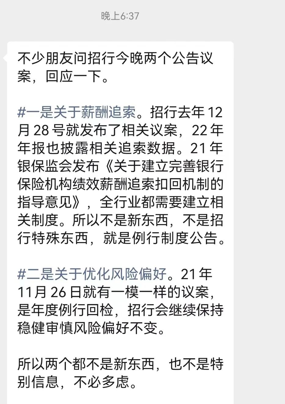 一位不愿具名的招行人士对财联社记者表示,对监事会通过相关议案引发市场关注表示意外。该人士称,招行很早就披露了相关管理办法,公告只是按流程办事。
