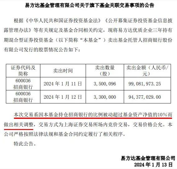 持仓超限导致的被迫调整并不鲜见,但是公告出来的极少,因为这种情况并不需要公告,这次公告其实是因为关联事项,刚好易方达优质企业三年持有期混合(009342)的基金托管人就是招商银行。该基金买卖招商银行都是需要公告的。