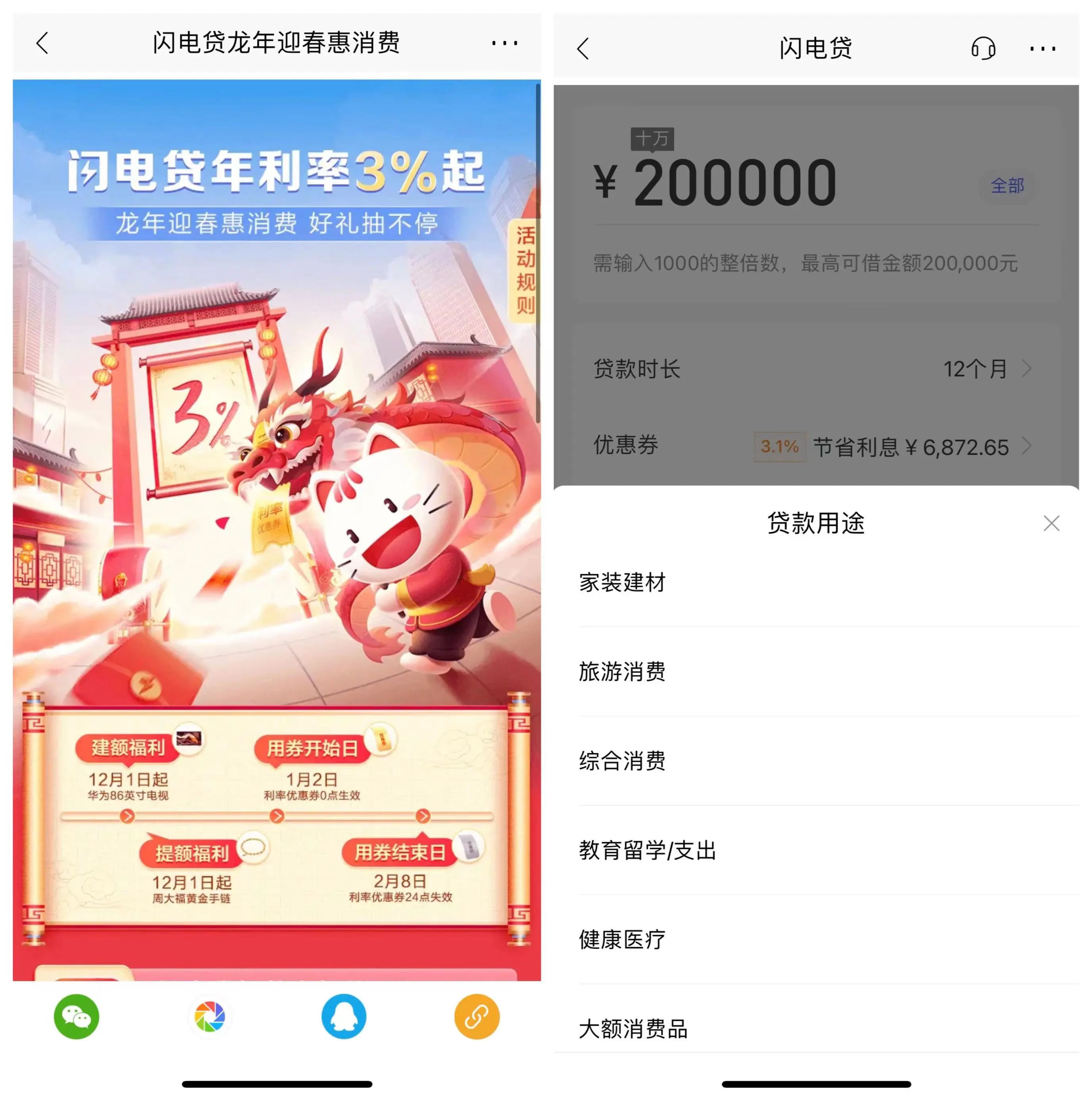王婷发现,她还不是最低的,打开招行App首页,映入眼帘的就是“龙年迎春惠消费,闪电贷年利率3%起”的横幅。点进去活动规则显示,2024年1月2日~2月8日期间,达到一定要求的客户,将获得3%闪电贷利率券,还能参与抽奖,奖品包括电视、黄金手链、拉杆箱等。