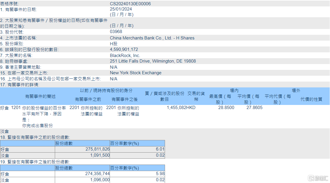 格隆汇1月31日丨根据联交所最新权益披露资料显示,2024年1月25日,招商银行(03968.HK)遭BlackRock, Inc.在场内以每股均价27.8605港元减持好仓145.51万股,涉资约4053.93万港元。