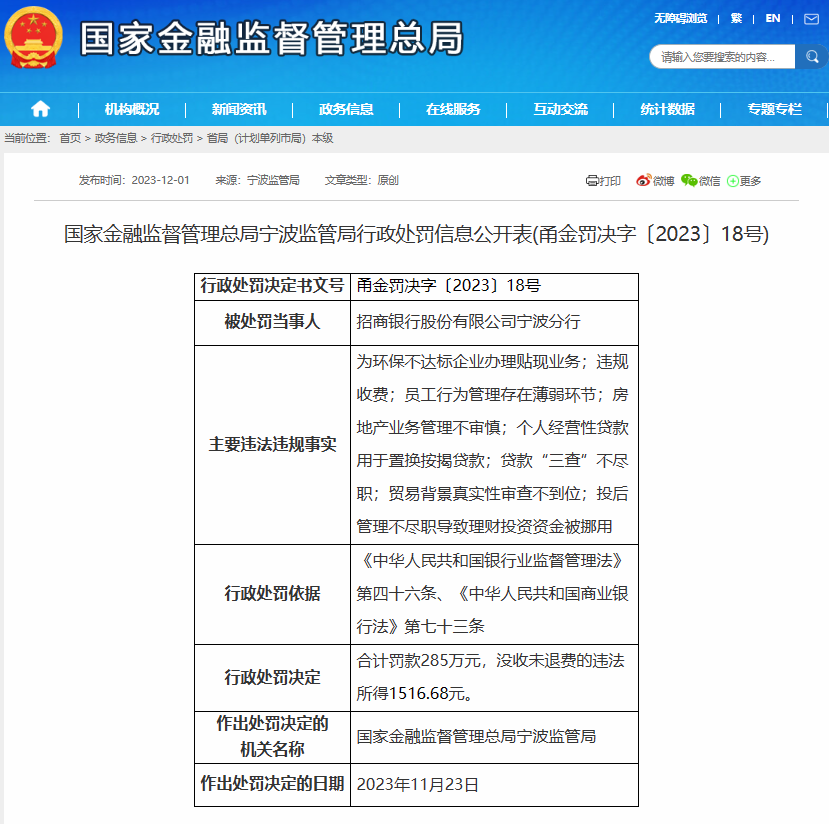 2023年12月1日,招商银行股份有限公司宁波分行被国家金融监督管理总局宁波监管局处以罚款285万元,并没收退费的违法所得1516.68万元。主要违法违规事实为:“为环保不达标企业办理贴现业务;违规收费;员工行为管理存在薄弱环节;房地产业务管理不审慎;个人经营性贷款用于置换按揭贷款;贷款“三查”不尽职;贸易背景真实性审查不到位;投后管理不尽职导致理财投资资金被挪用”