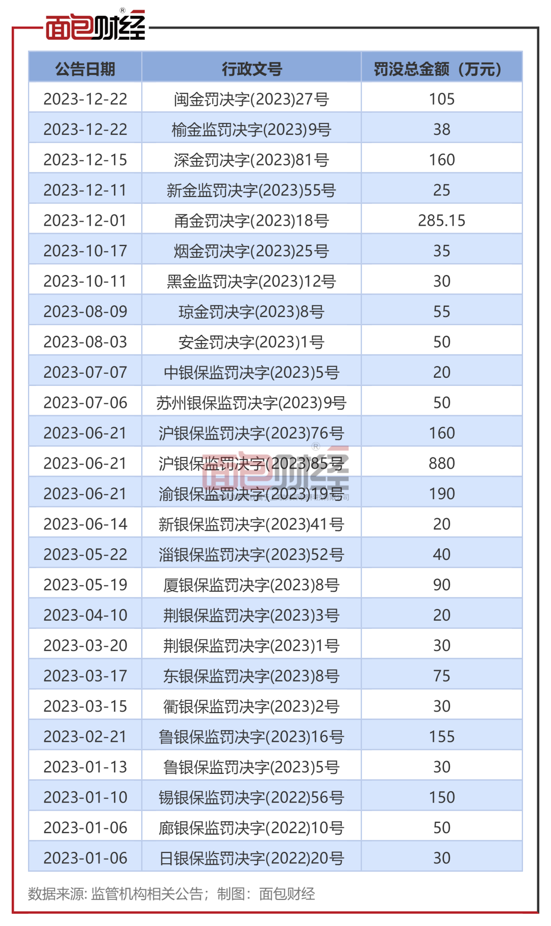 面包财经梳理国家金融监管总局(含原银保监会)及其分支机构数据发现,2023年招商银行累计收到26张涉及机构的罚单,累计罚没2803.2万元。其中,有8张罚款被罚没金额超过万元。