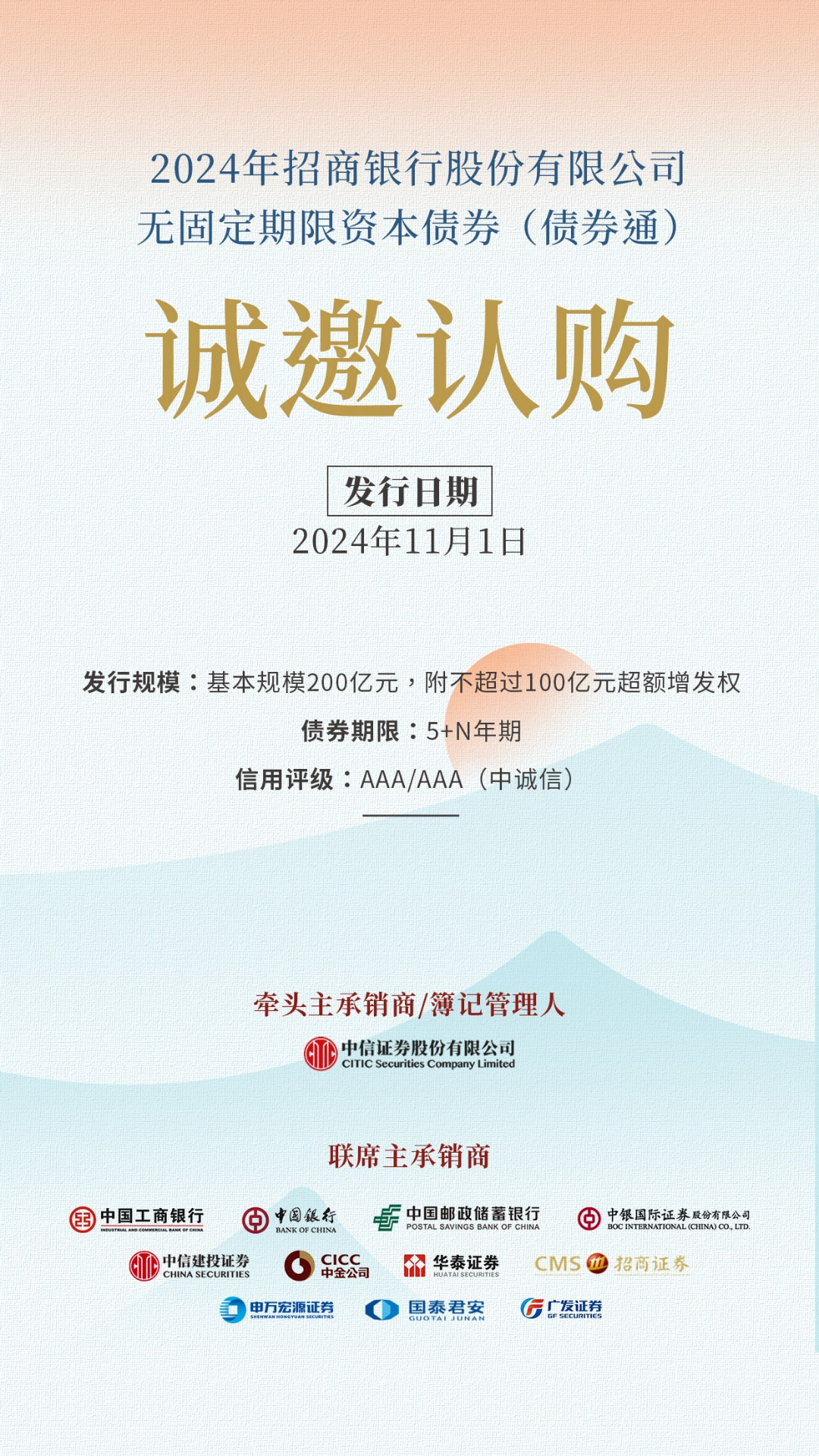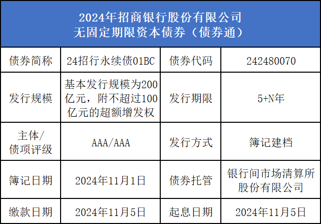 招商银行股份有限公司将于2024年11月1日在银行间债券市场发行2024年招商银行股份有限公司无固定期限资本债券(债券通),债券期限为5+N年期,主体与债项评级均为AAA。本期债券基本发行规模为200亿元,附不超过100亿元的超额增发权。本期债券募集资金将依据适用法律和主管部门的批准用于补充发行人其他一级资本。