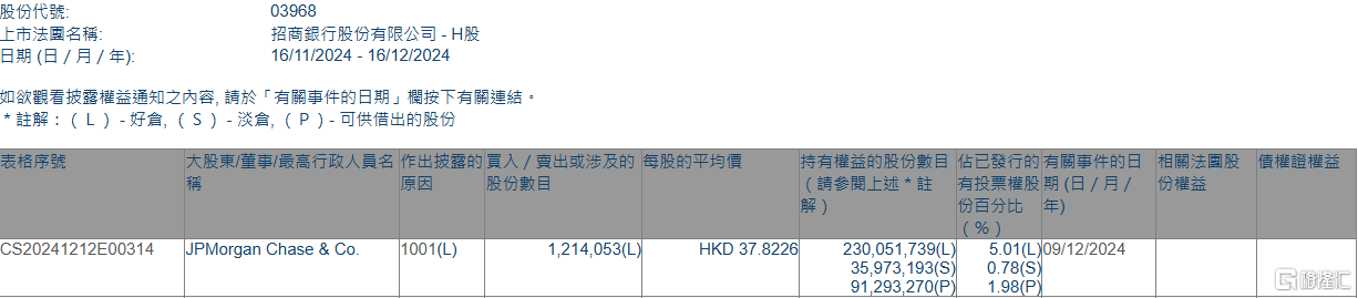 格隆汇12月16日丨根据联交所最新权益披露资料显示,2024年12月9日,招商银行(03968.HK)获JPMorgan Chase & Co.以每股均价37.8226港元增持好仓121.41万股,涉资约4591.86万港元。