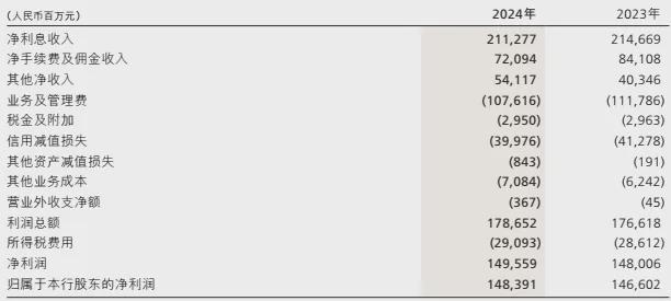 之所以盈利还能微增,除了招商银行2024年包括员工、业务费在内的“业务及管理费”同比下降41亿元外,还跟该年“信用减值损失”下降13亿元密切相关。
