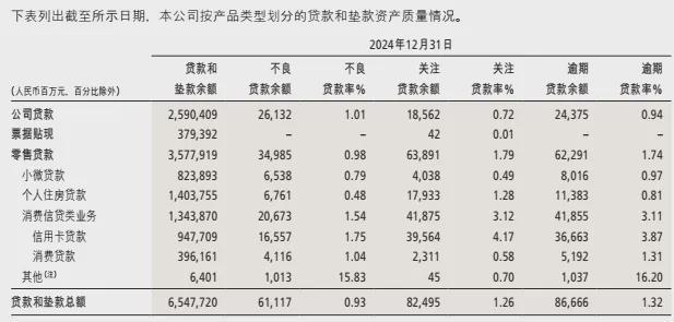 从下图看,招商银行截至2024年底公司类贷款不良规模及不良率、关注类贷款规模及占比均有下降,而与之相反,零售贷款不良规模及不良率、关注类贷款规模及占比却均有上升,重中之重还是信用卡不良规模及不良率继续高企。