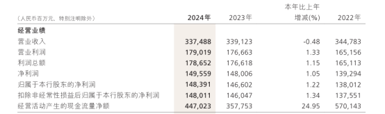 报告显示,公司2024年营业收入为3374.88亿元,同比下降0.48%;归母净利润为1483.91亿元,同比增长1.22%。