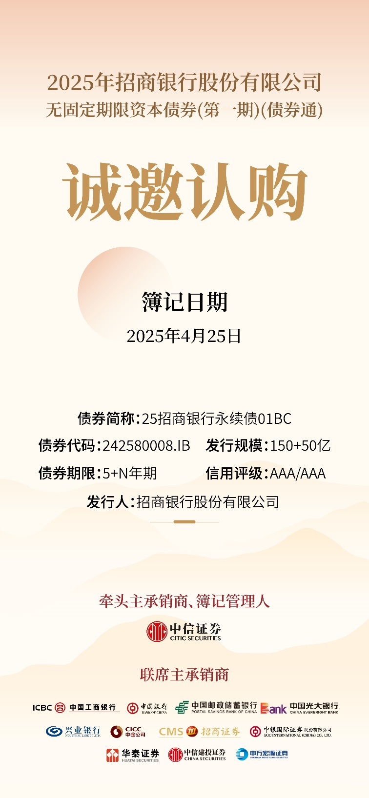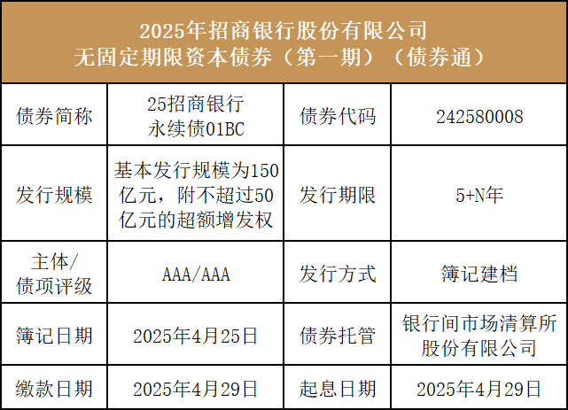 2025年4月25日,招商银行股份有限公司(以下简称“招商银行”或“发行人”)将在全国银行间债券市场发行2025年招商银行股份有限公司无固定期限资本债券(第一期)(债券通)。本期债券基本发行规模为150亿元,附不超过50亿元的超额增发权,期限为5+N年期,主体与债项评级分别为AAA/AAA。本期债券募集资金将依据适用法律和主管部门的批准用于补充发行人其他一级资本。