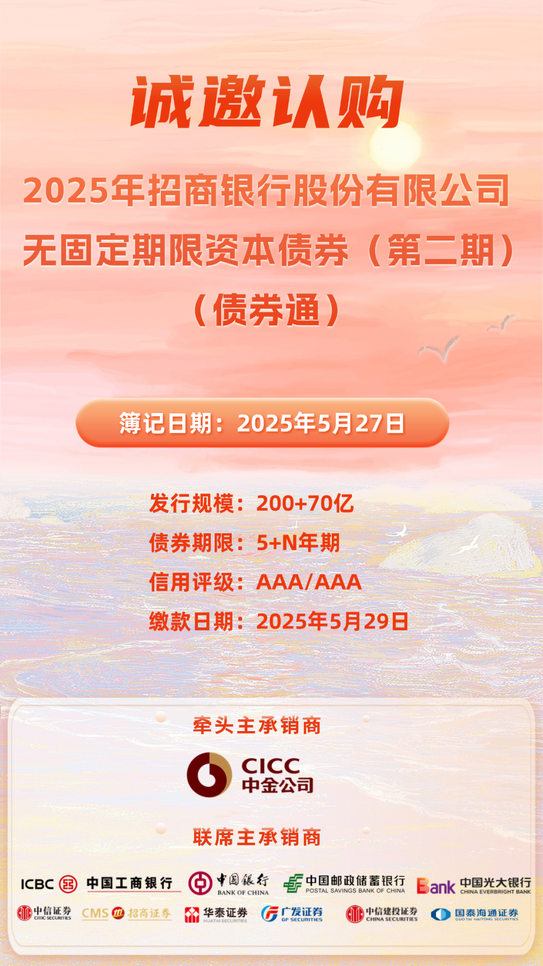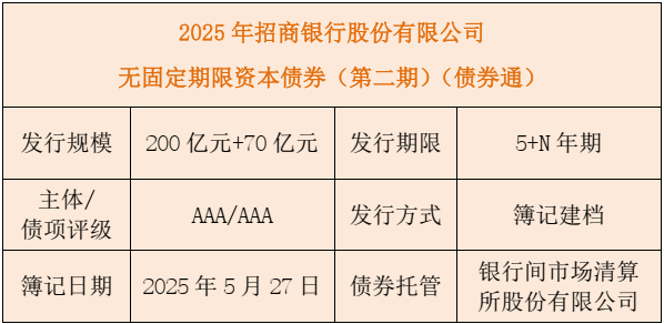2025年5月27日,招商银行股份有限公司(以下简称“招商银行”或“发行人”)将在全国银行间债券市场发行2025年无固定期限资本债券(第二期)(债券通)。本期债券的基本发行规模为人民币200亿元,附不超过70亿元的超额增发权,债券期限与发行人持续经营存续期一致,主体与债项评级分别为AAA/AAA。本期债券的募集资金将依据适用法律和主管部门的批准用于补充发行人其他一级资本。
