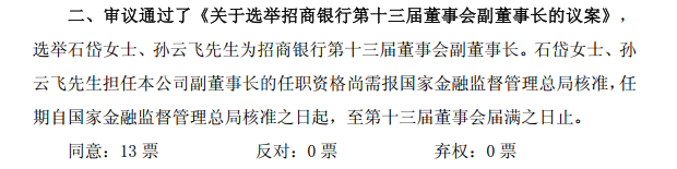 图片系招商银行审议通过选举石岱、孙云飞为副董事长