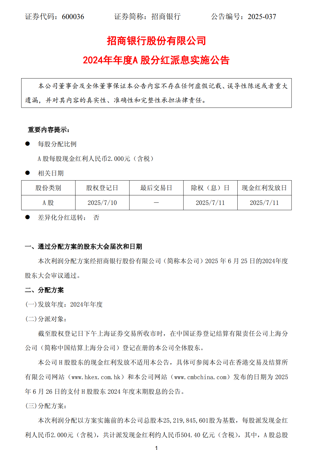招商银行今日发布《2024年年度A股分红派息实施公告》,宣布向全体A股股东每股派发现金红利2.000元(含税),合计派发金额约504.40亿元,其中A股现金红利达412.58亿元。此次分红方案延续了招行一贯的高比例分红政策,以公告日假设股价35元/股计算,股息率约为5.7%。根据安排,股权登记日为2025年7月10日,除权及现金红利发放日为7月11日。