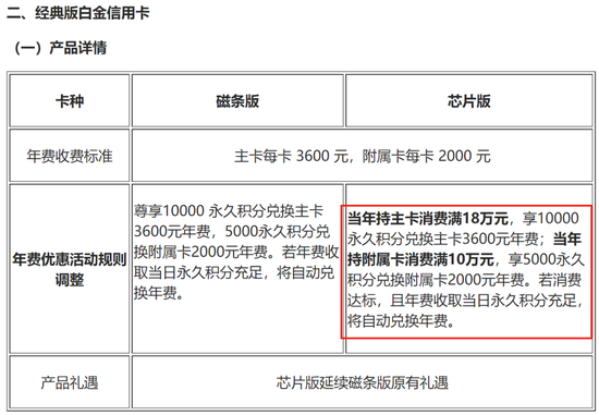 7月1日,招行信用卡中心发布公告称,自2025年9月1日起,对已发行的银联-Visa双标高端磁条卡产品,更换为芯片版产品。其中,升级后的经典版白金信用卡主卡,必须年消费满18万元才有资格用1万积分兑换3600元的年费;附属卡也新增了消费满10万元的门槛。