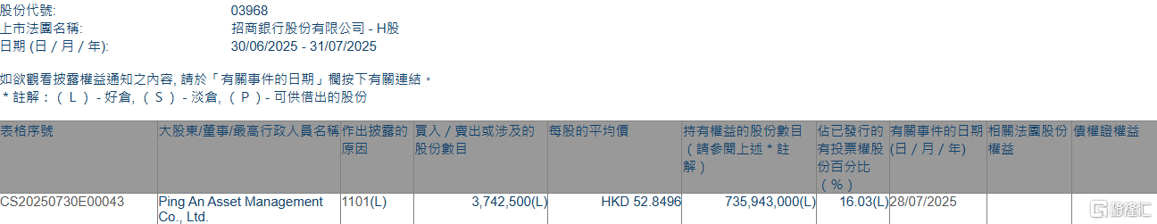 格隆汇7月31日丨根据联交所最新权益披露资料显示,2025年7月28日,招商银行(03968.HK)获Ping An Asset Management Co., Ltd.在场内以每股均价52.8496港元增持374.25万股,涉资约1.98亿港元。