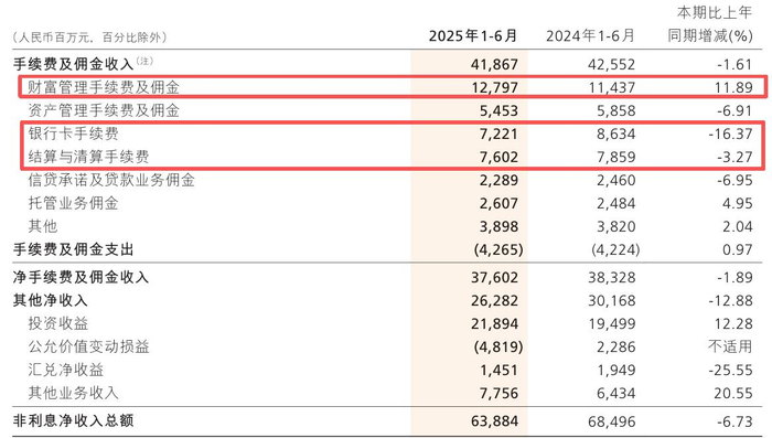 在招商银行的非利息净收入构成中,财富管理手续费及佣金收入实际在上半年实现了增速同比转正,增幅约为11.89%。但与此同时,该行的银行卡手续费收入、结算与清算手续费收入均出现了下滑,降幅分别为16.37%和3.27%。