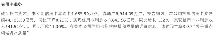 招商银行在财报解释称,上述两项指标的下滑主要是受信用卡交易量下降影响。具体来看,该行上半年信用卡流通卡9692.67万张,流通户6963.32万户,均较2024年末有所增长,但信用卡交易额却同比下滑8.54%至2.02万亿元。