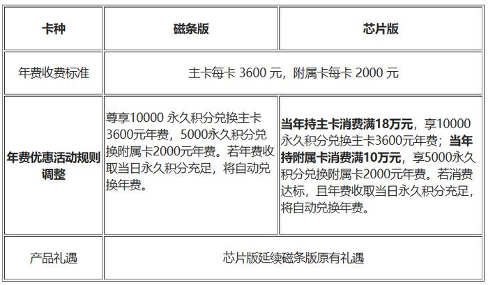 具体来看,精致版白金信用卡新增了每年2次300精选酒店贵宾价入住等礼遇;经典版白金信用卡则在10000永久积分兑换主卡年费、5000永久积分兑换附属卡年费的基础上,增加了主卡需消费满18万元、附属卡消费满10万元的门槛。