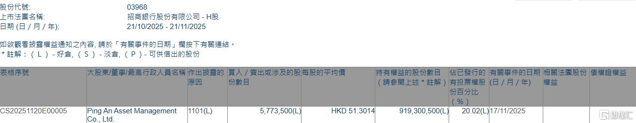 格隆汇11月21日丨根据联交所最新权益披露资料显示,2025年11月17日, 招商银行 (03968.HK)获Ping An Asset Management Co., Ltd.在场内以每股均价51.3014港元增持577.35万股,涉资约2.96亿港元。