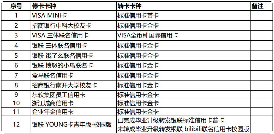 此外, 招商银行 将针对部分前期已停止发行卡片的转卡卡种进行变更,涉及卡片信息如下: