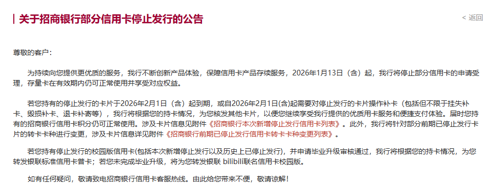 公告显示,2026年1月13日(含)起, 招商银行 将停止部分信用卡的申请受理,存量卡在有效期内仍可正常使用并享受对应权益。