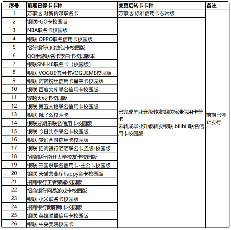 若用户持有停止发行的校园版信用卡(包括本次新增停止发行以及历史上已停止发行),并申请毕业升级审核通过, 招商银行 将根据用户的持卡情况,为用户转发银联标准信用卡普卡;若用户未完成毕业升级,将为用户转发银联bilibili联名信用卡校园版。