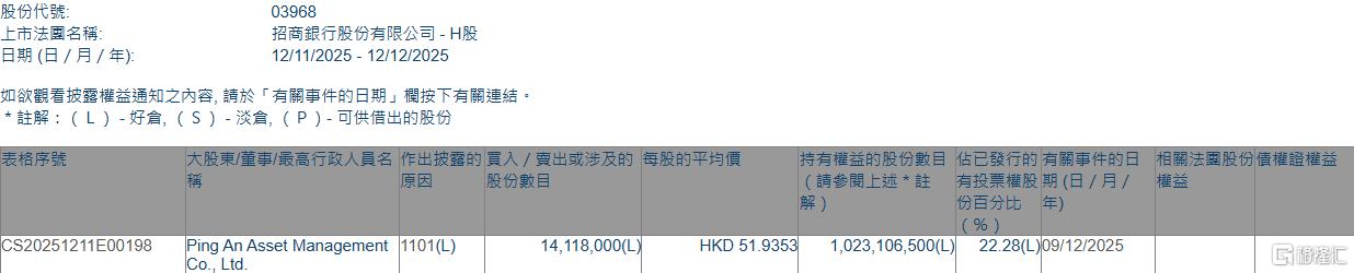 格隆汇12月12日丨根据联交所最新权益披露资料显示,2025年12月9日, 招商银行 (03968.HK)获Ping An Asset Management Co., Ltd.在场内以每股均价51.9353港元增持1411.8万股,涉资约7.33亿港元。