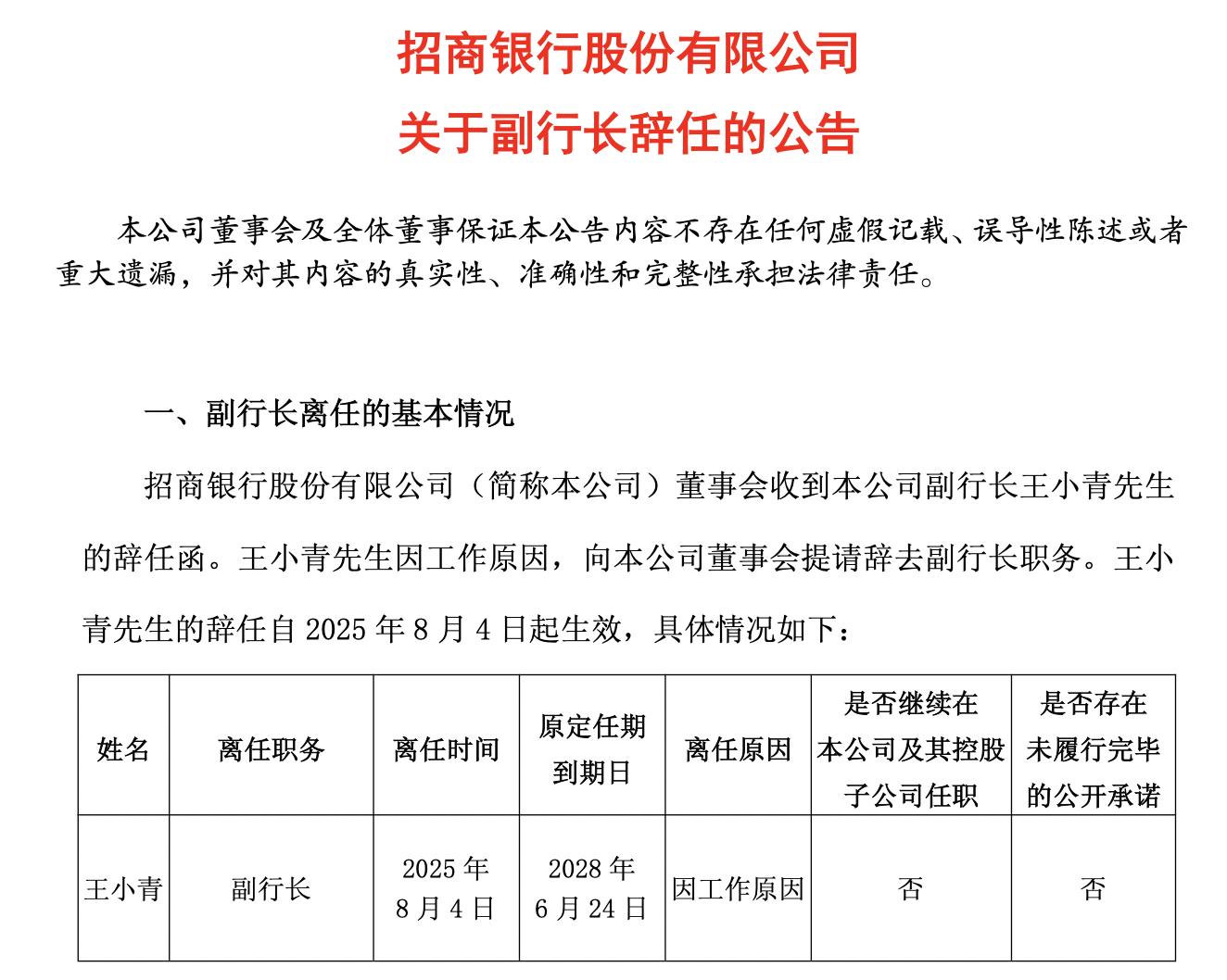 值得关注的是,今年8月4日,招商银行发布公告称,公司董事会收到公司副行长王小青的辞任函。王小青因工作原因,向公司董事会提请辞去副行长职务。王小青的辞任自当日起生效。