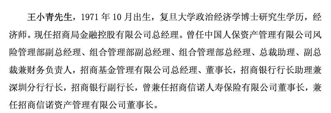 资料显示,王小青,1971年10月出生,复旦大学政治经济学博士研究生学历,经济师。现任招商局金融控股有限公司总经理。