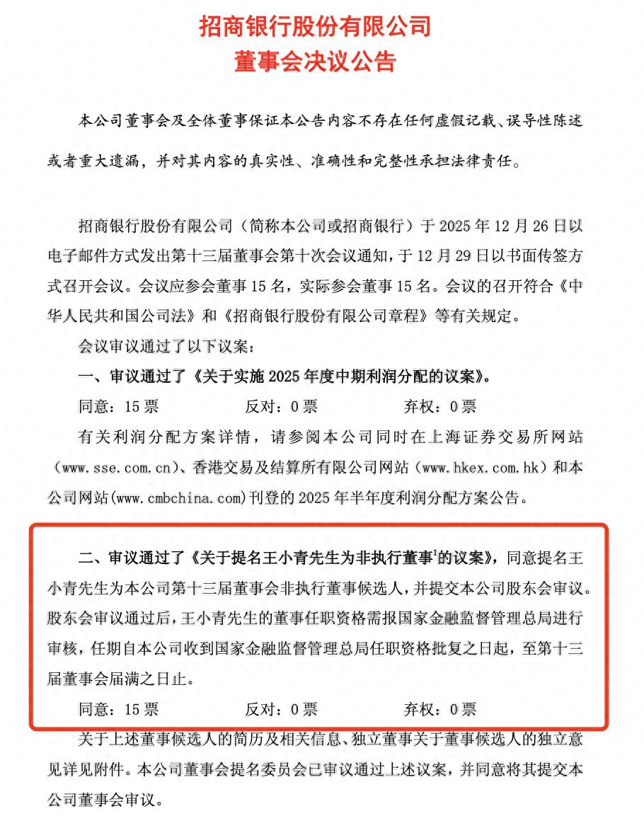 12月29日,招商银行发布董事会决议公告,审议通过了《关于提名王小青先生为非执行董事的议案》,同意提名王小青为公司第十三届董事会非执行董事候选人,并提交公司股东会审议。