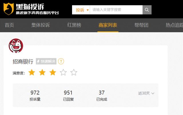 监管层面的罚单密集落地,也与消费端的投诉高发形成了呼应。在黑猫投诉平台,招商银行累计投诉件数达到41108件,已完成投诉仅23753件,近30天内投诉量为972件,其中已完成投诉仅37件,实际解决率也偏低。投诉焦点主要集中在违规催收、循环利息未尽格式条款提示义务、协商还款难等问题。