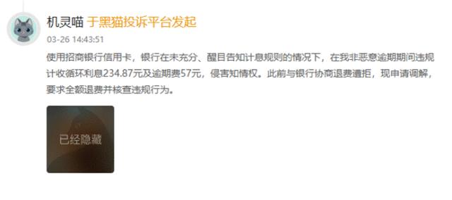 3月26日,有消费者表示“银行在未充分、醒目告知计息规则的情况下,在我非恶意逾期期间违规计收循环利息234.87元及逾期费57元,侵害知情权。此前与银行协商退费遭拒,现申请调解,要求全额退费并核查违规行为。”