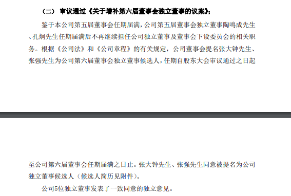 据了解,因歌华有线第五届董事会独立董事陶鸣成先生、孔炯先生任期届满后不再继续担任独立董事及董事会下设委员会的相关职务。因此其公司董事会提名张大钟先生、张强先生为第六届董事会独立董事候选人。