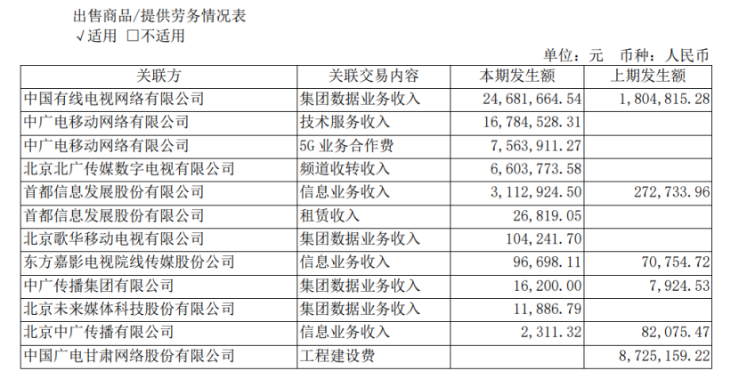 另外,财报数据中显示,歌华有线上半年向中广电移动网络有限公司出售的技术服务收入为1678.45万元,涉及的5G业务合作费为756.39万元。