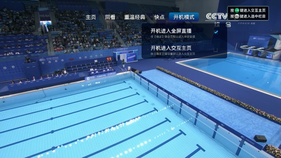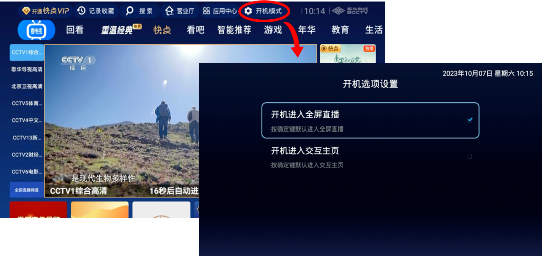 此外,为方便用户自行选择开机模式,歌华有线进一步优化功能设置,在交互模式和全屏直播模式下,均增加了“开机模式”入口,用户可快速点击进入,完成“开机进入全屏直播”或“开机进入交互主页”设置。