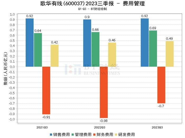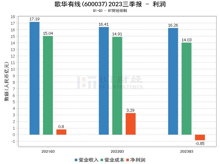 在利润方面,歌华有线2023年三季度的营业收入为16.26亿元,与上年同期的16.41亿元相比略有下降。营业利润为-3620.85万元,与上年同期的3.33亿元相比,公司的盈利能力有所下滑。净利润为-8453.96万元,与上年同期的3.27亿元相比,公司的净利润出现了较大幅度的下滑。这些数据显示,尽管公司的营业收入保持稳定,但净利润的大幅下滑表明公司的盈利能力出现了下滑。