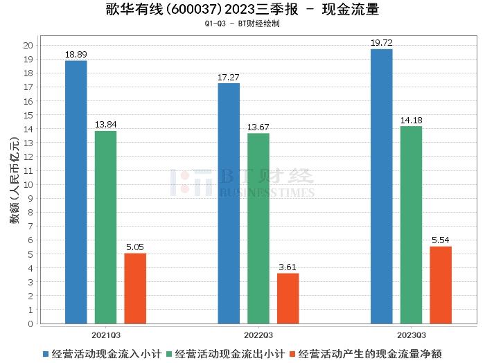 在现金流量方面,歌华有线2023年三季度的经营活动产生的现金流量净额为5.54亿元,较上年同期的3.61亿元有所增加。经营活动现金流入小计为19.72亿元,较上年同期的17.27亿元有所增加。经营活动现金流出小计为14.18亿元,较上年同期的13.67亿元有所增加。这些数据显示,公司的现金流量状况良好,经营活动产生的现金流量净额增加,有利于公司的日常运营和发展。